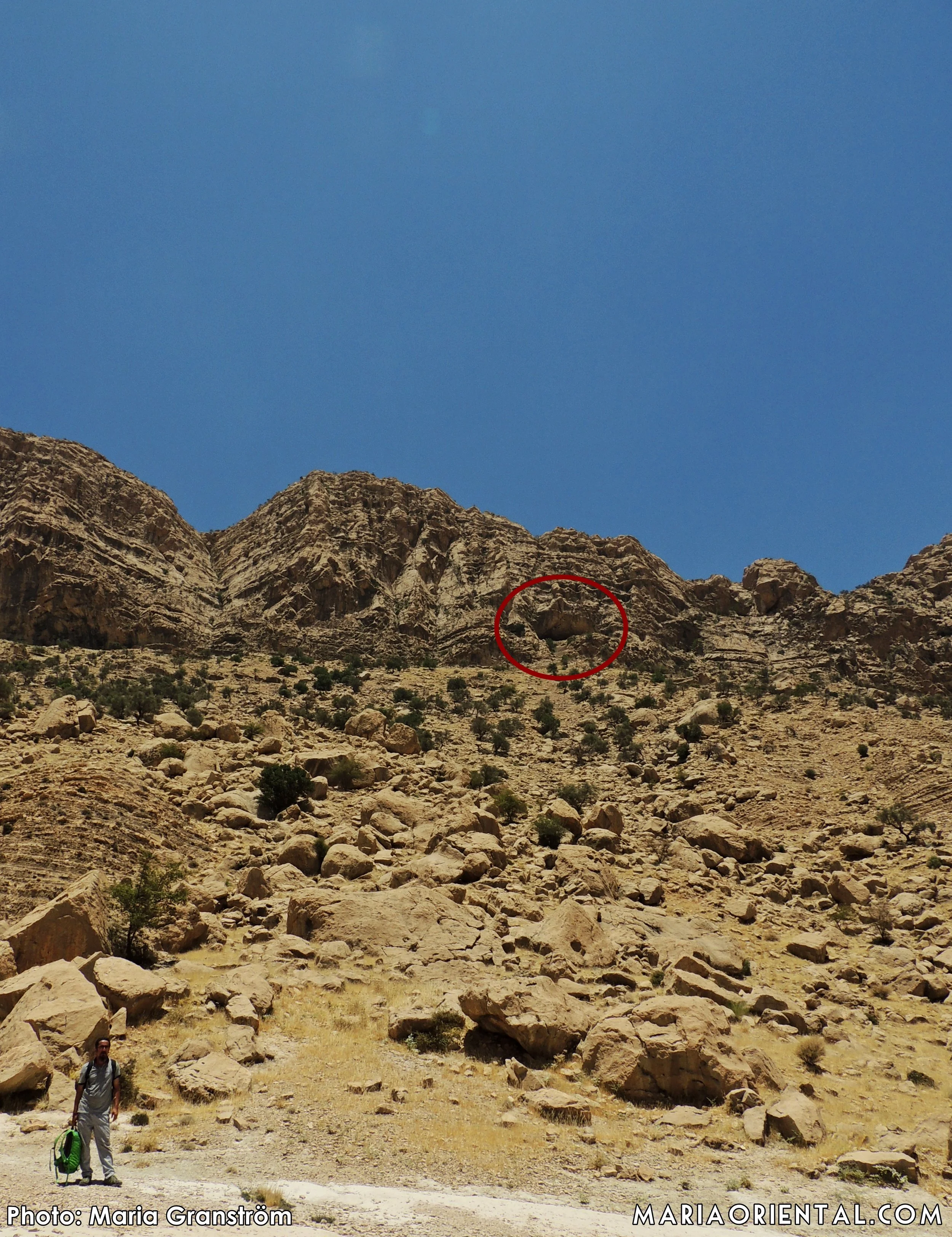 When I’d read about this statue I understood that it was placed in limestone cave outside the city Bishapur, about two hour car ride from Shiraz. The statue is dated to about 260 A.D. and is the biggest one found from the Sasanian era. It’s made out of stalagmite and is 6,7 x 3,4 meters. The cave itself is 800 meters above the foot of the mountain, which should be about 1280 meters above sea level, and it would be around a 90 minute walk to reach the entrance.